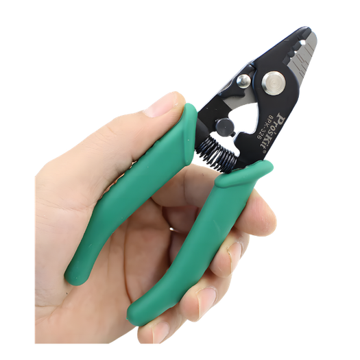The Pro’sKit 8PK-326 Fiber Optic Stripper is a trusted and widely used fiber optic stripper, preferred by a majority of technicians for its reliability and consistent performance in FTTH, telecom, and cable TV (CATV) applications. Designed with a precision 3-hole stripping mechanism, it efficiently removes the 2–3mm outer jacket, 900µm buffer, and 250µm coating without damaging the fiber. Built with high-quality materials and factory-calibrated blades, it ensures clean, accurate stripping every time. Its ergonomic grip and durable construction make it ideal for daily field use, making the Pro’sKit 8PK-326 a go-to choice for professionals seeking dependable and efficient fiber optic stripping tools.